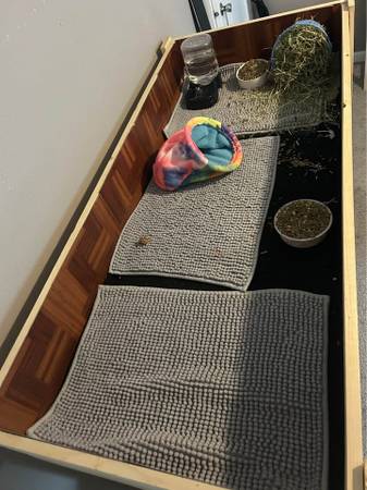 Big handmade guinea pig cage made with wood planks and lined with vinyl peel & stick squares. Perfect to clean easily and allows plenty of room for your small animal(s) to run around. This was built with the idea of having multiple guinea pigs, but I decided against that idea and now this is simply too much cage. I will downsize. This cage comes with a ramp that connects the top to the bottom and has a side guard if you’re worried about your animal falling off the ramp, but it can be easily removed and uninstalled. Right now it’s unattached as only the top tier of cage is being used.